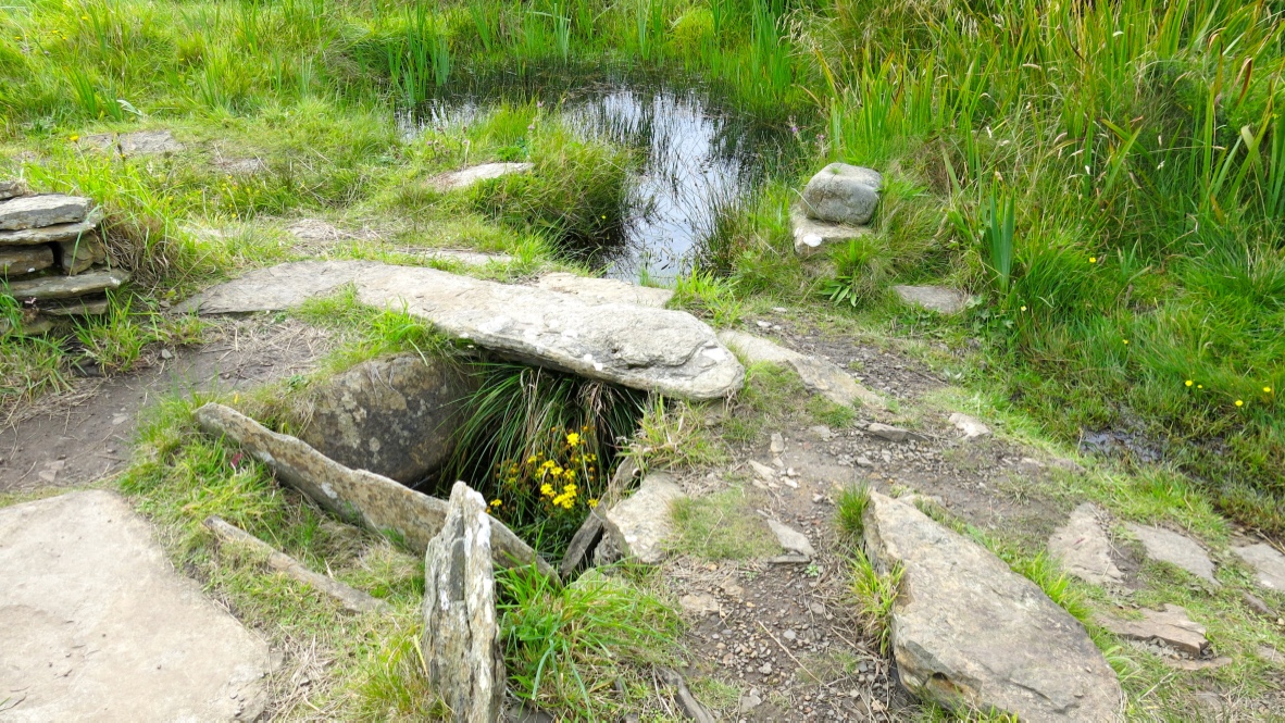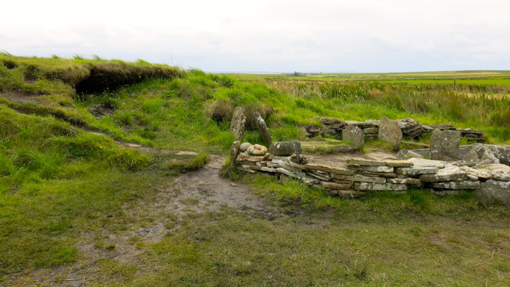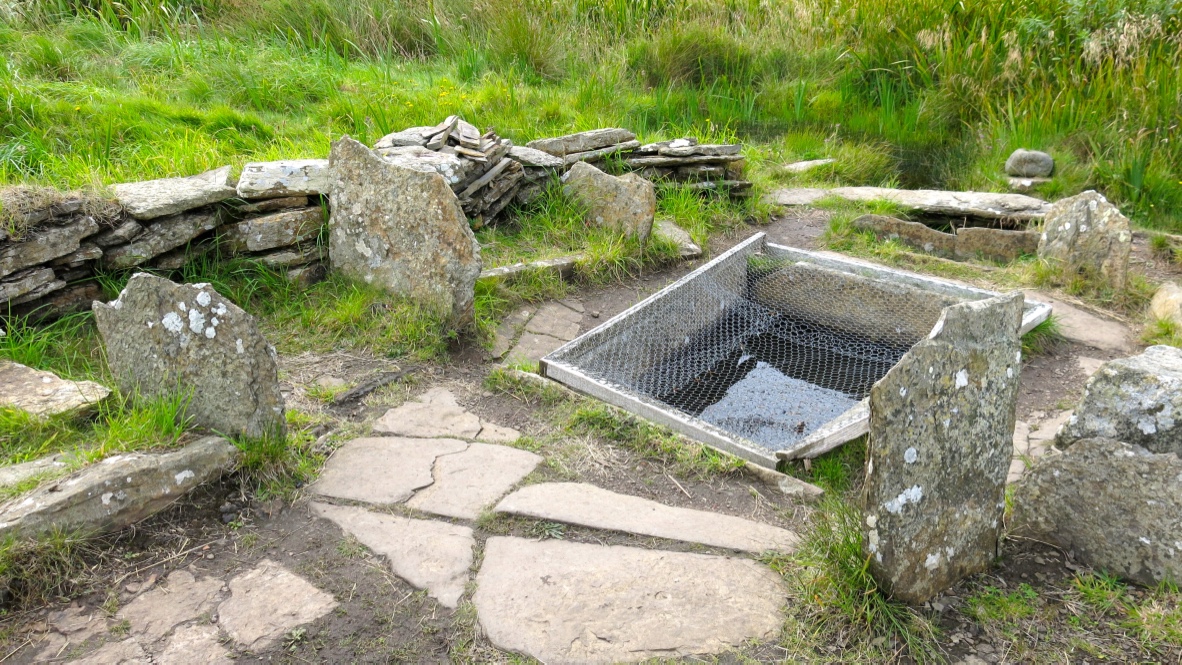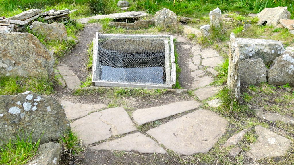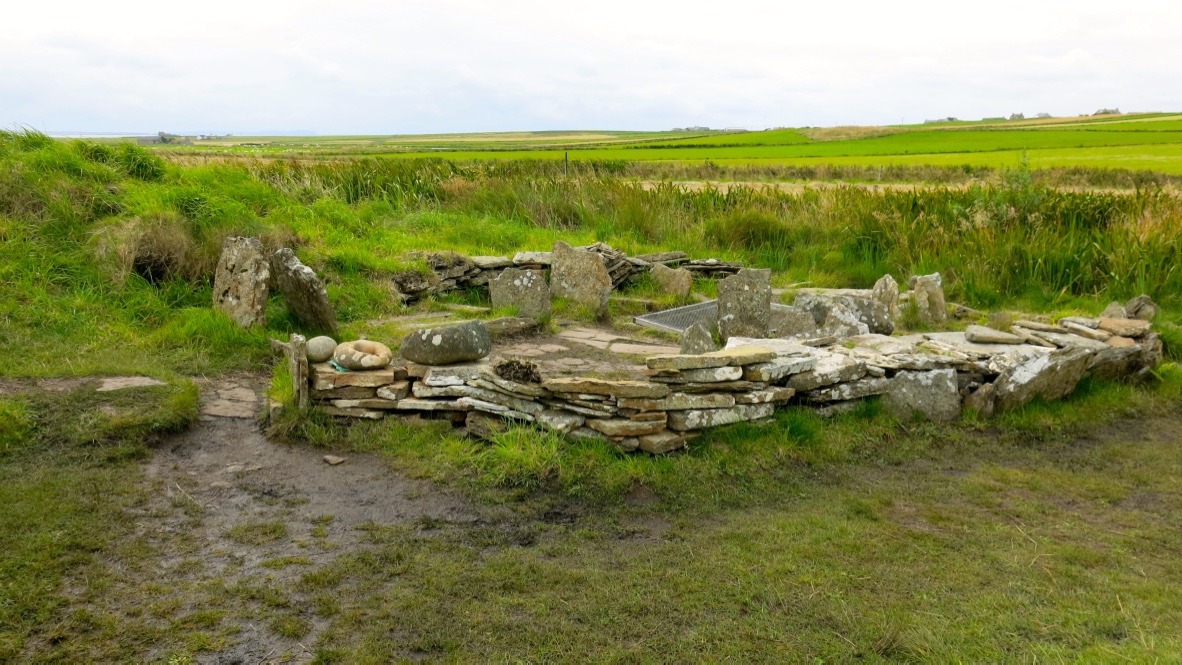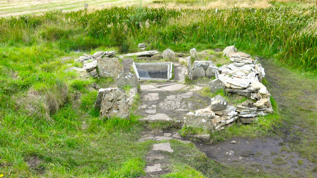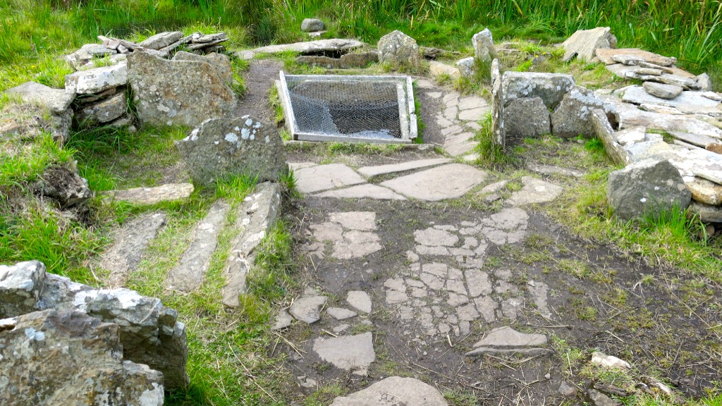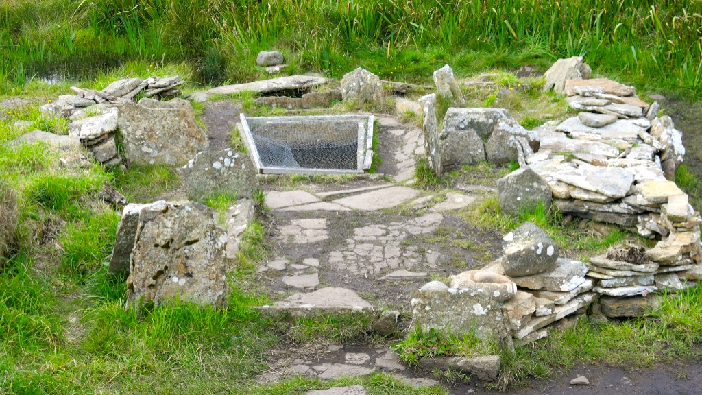 Liddle Burnt Mound and Bronze Age building are situated on the island of South Ronaldsay, Orkney, on Liddle Farm. Thich is also the location of Isbister Chambered Cairn, or ‘Tomb of the Eagles’, as it is known (see here). The site was constucted approximately 3,000 years ago and was in use for around 1,000 years. The oval, double-walled building contains a large trough, a well and a drainage system to channel away the dirty water. There is also a hearth where is is supposed that stones were heated up then rolled across the floor and dropped into the trough to heat up the water.